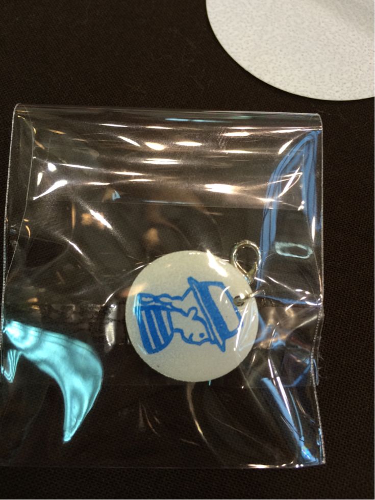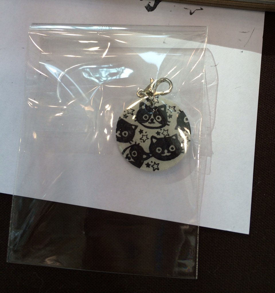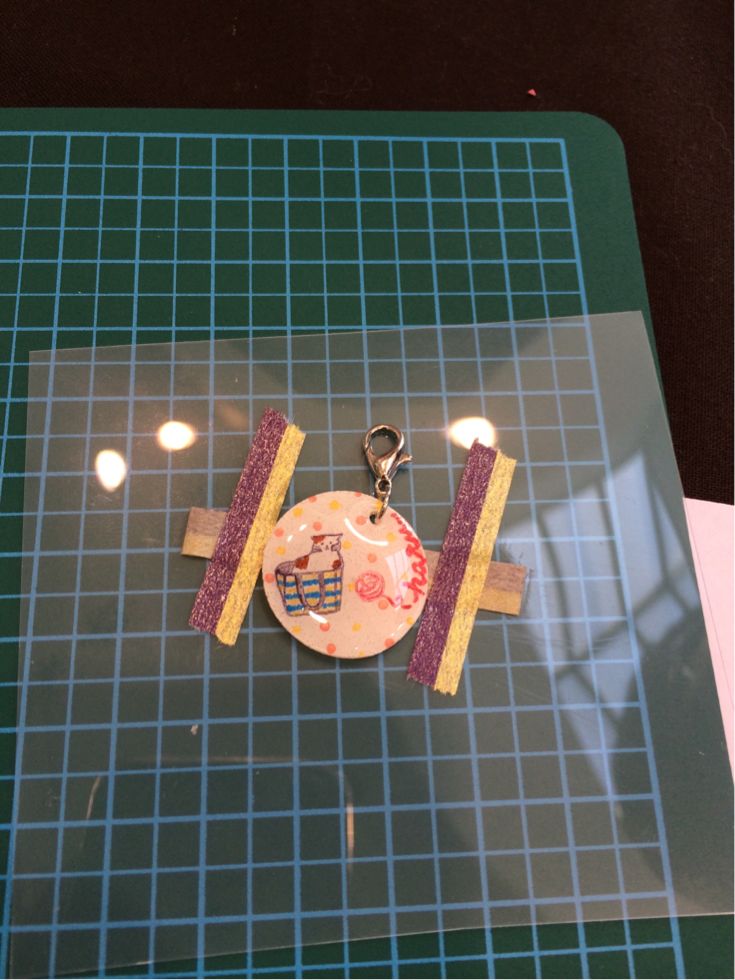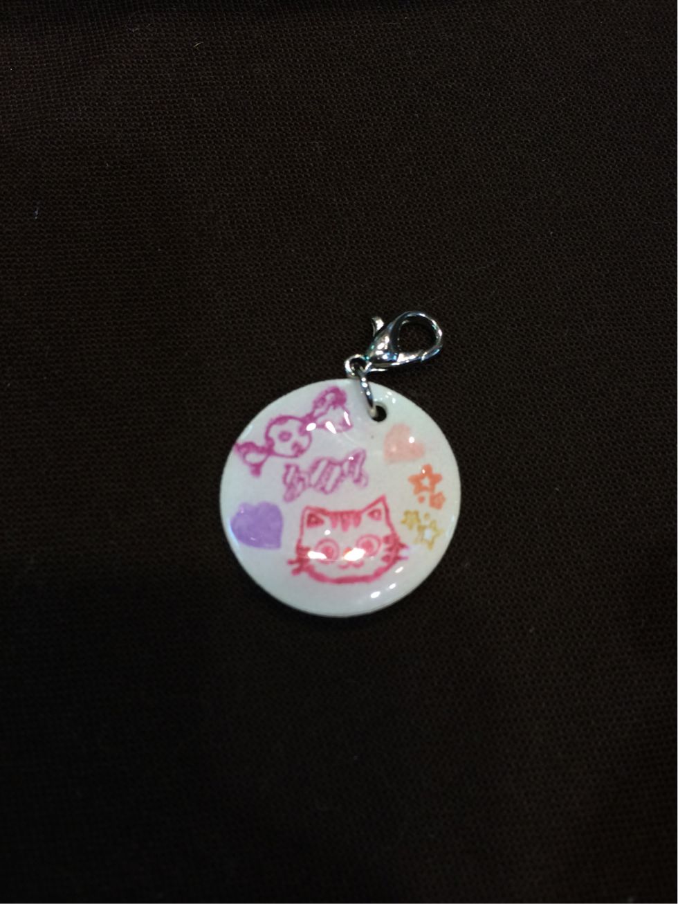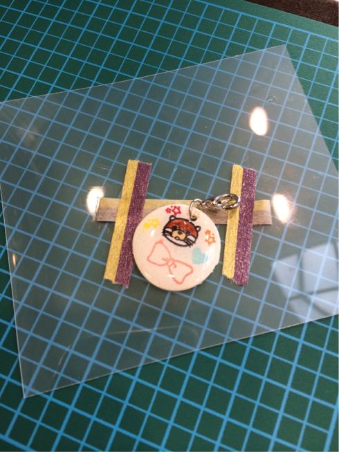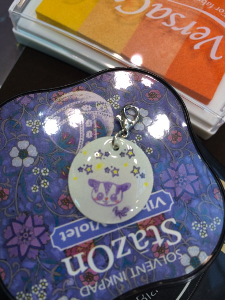 そのはんこをプラバンに捺して縮めてレジンでコーティングし、金具をつけてチャームにしていただきました。